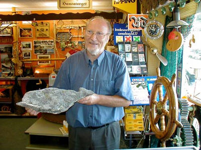 står framleis i hyllene, innimellom gamle skipsklokker, stein, ror,
