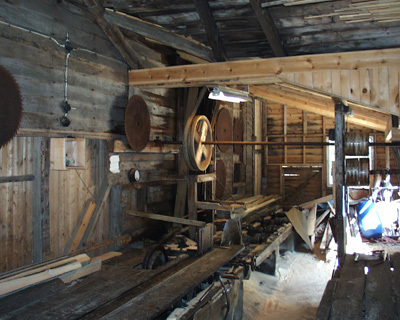 har ein nytta vinsj for å dra tømmeret inn på saga.
