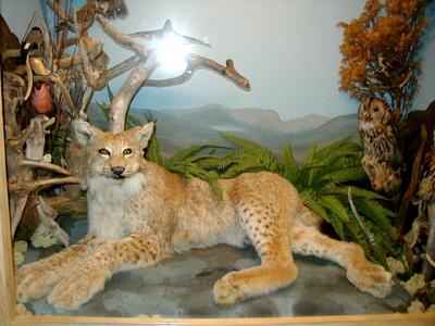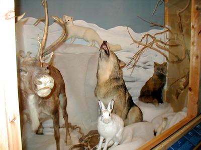 dyr og fuglar i utstoppa tilstand.