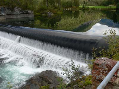 Inntaket til Hellandsfoss kraftverk er regulert av ei vassfylt gummiluke - ei gummipølse som ligg tvers over elveløpet.