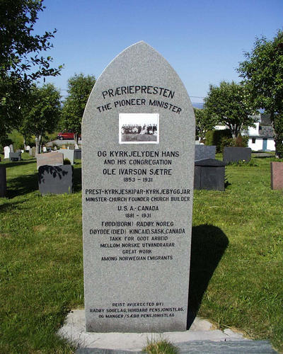 Bautasteinen over -Præriepresten og kyrkjelyden hans, knytt til emigrantpresten Ole Ivarson Saetre, sumboliserer den sentrale rolla kyrkja fekk i dei norske utvandringsmiljøa i Amerika. |