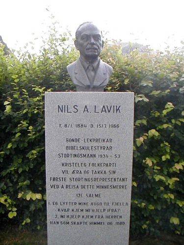 Utanfor kyrkja står eit minnesmerke over Nils A. Lavik. (08.01.1884 - 15.07.1966). Lavik var bonde, lekpreikar og bibelskulestyrar. I åra 1934-53 var han stortingsmann - og Kristeleg Folkeparti sin første stortingsrepresentant.