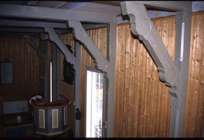 Restar etter rosemalte tømmerveggar i den gamle tømmerkyrkja på Stamnes, bygd i byrjinga av 1600-talet og riven i siste halvdel av 1800-talet. Foto: Arne Høyland.