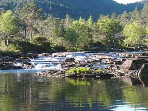 med skiftande vegetasjon frå strandkanten til dei høge åsane