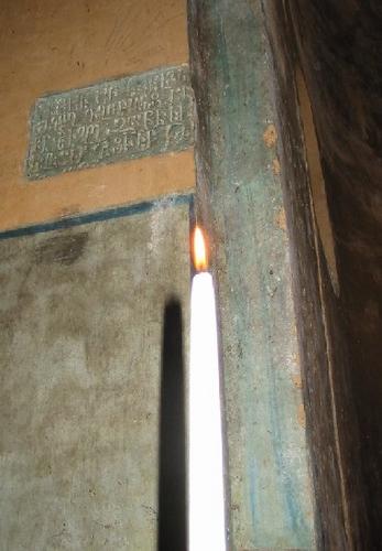 Et lys er blitt tent inne i den gamle kirken i Nich.