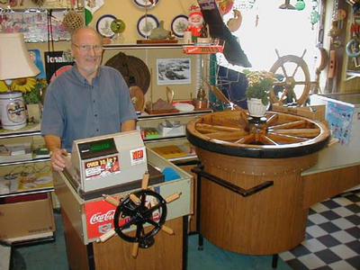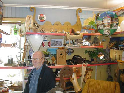 I hyllene innanfor kan du sjå raritetar og skipsklokker