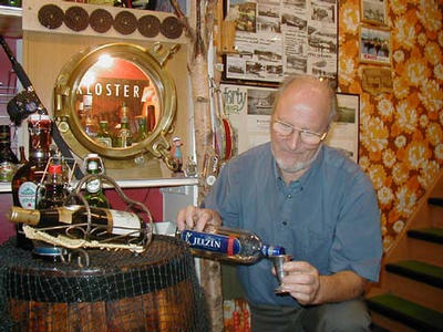 Grant whiskyflaske med ein slant på). På kahytta (lokket til