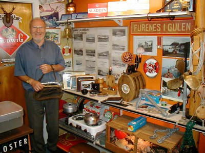 står framleis i hyllene, innimellom gamle skipsklokker, stein, ror,