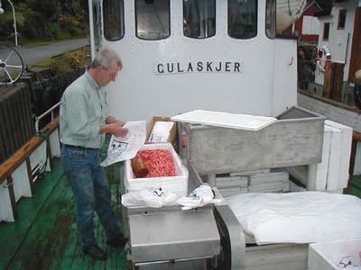 legg til kai. På dekk står fleire isoporkassar og Svein Kvamme
